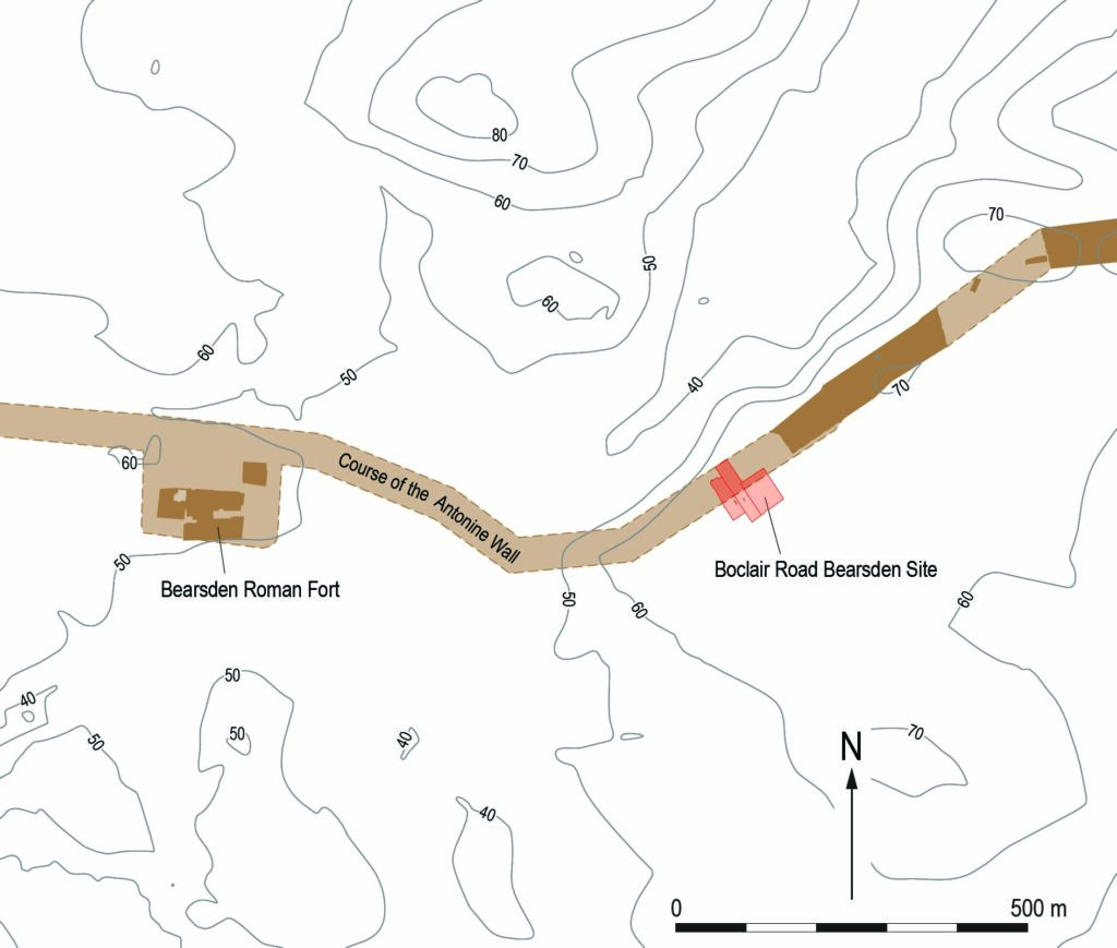 Contour map with location of present work and Bearsden Roman fort © GUARD Archaeology Ltd